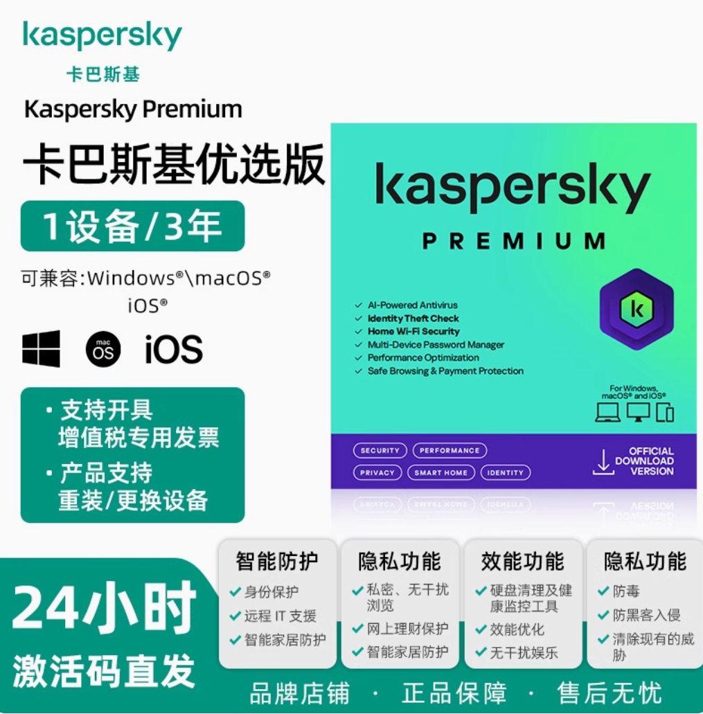 Kaspersky卡巴斯基优选版1用户3年安全杀毒防毒软件 家庭防护新订阅Vip会员激活码for mac正版去广告支持重